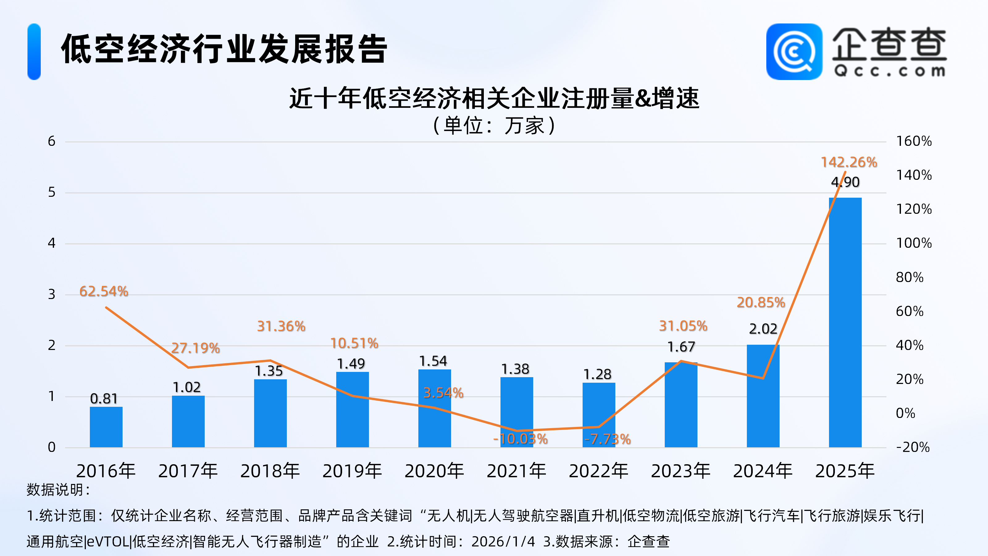 1月4日,上海市印发《上海市关于链接长三角加快建设低空经济先进制造业集群的若干措施》(以下简称《若干措施》),提出到2028年,上海低空经济核心产业规模达到800亿元左右,形成低空新型航空器完整产业链体系,建设低空经济国家先进制造业集群,加快迈向比较优势凸显的“世界eVTOL之都”。低空经济是以eVTOL、工业级无人机等新型航空器研制为核心竞争力,强化颠覆性技术创新引领,广泛开展有人驾驶和无人驾驶航空器的低空飞行活动,驱动设计制造、运营、消费多领域融合发展的创新性经济形态。企查查数据显示,截至1月4日,国内现存低空经济相关企业15.94万家,主要分布在华东地区、华南地区,分别占比27.91%、21.45%。注册资本上,近五成相关企业注册资本在200万元以下。注册量方面,2023年以来低空经济相关企业注册量呈逐年增长趋势,2025年注册量同比增长142.26%至4.9万家,达近十年来注册量及增速双高峰。eVTOL方面,企查查数据显示,截至目前,国内现存eVTOL相关专利达450项,其中70%相关专利申请于2024年及以后。1、主要分布在华东地区、华南地区